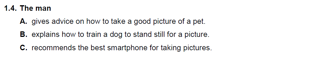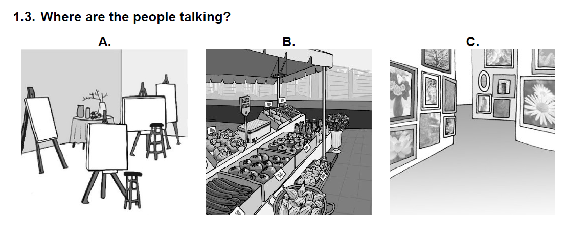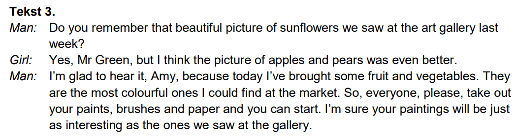 Zad. 1.3: “Dlaczego ‘art gallery’ (C) jest dystraktorem? Zobaczcie na Tekst 3. Usłyszeliśmy: ‘fruit and vegetables’. Czy to jest parafraza ‘market’ (B)?”