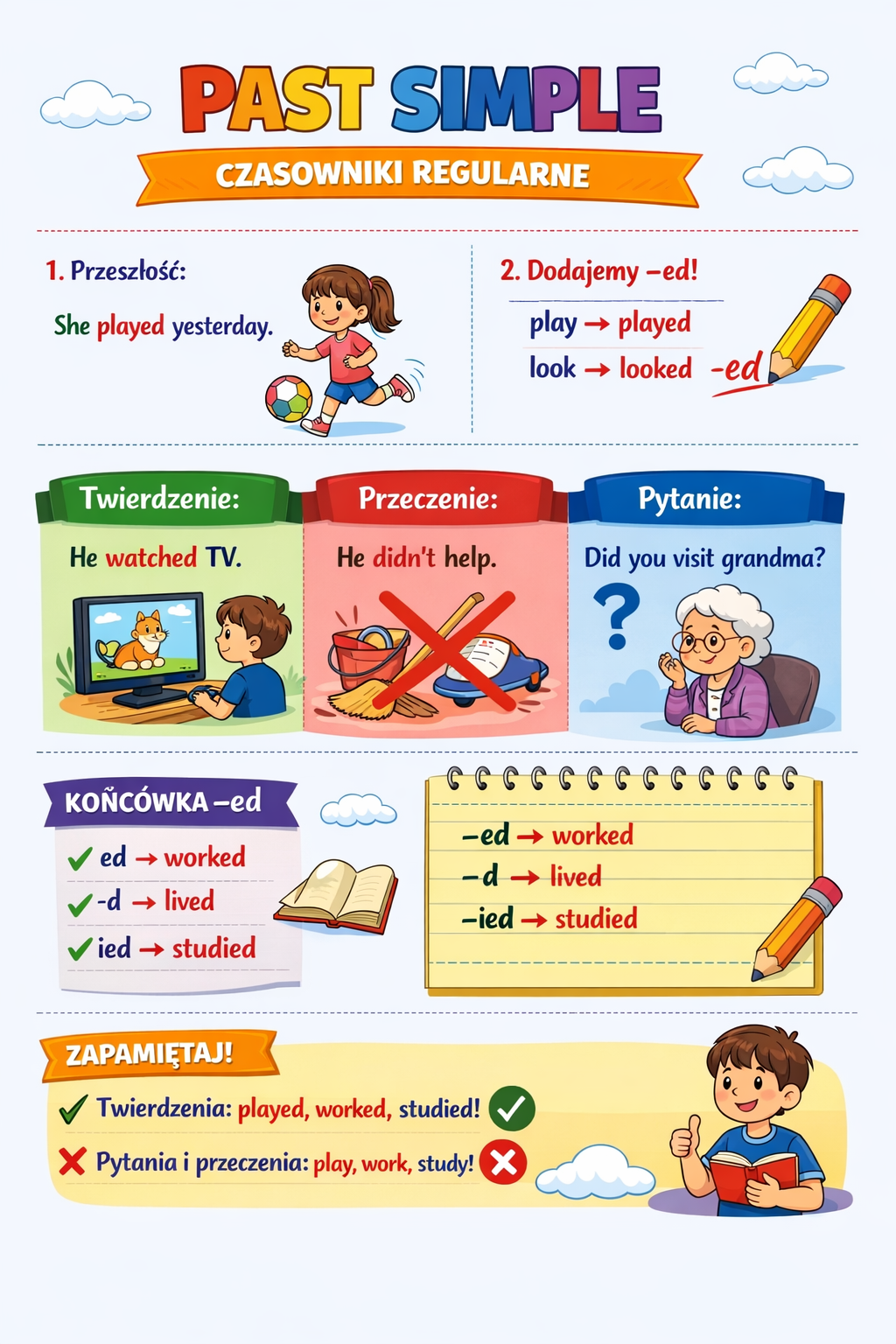 Uczeń potrafi tworzyć zdania twierdzące i przeczące w czasie przeszłym z użyciem czasowników regularnych.