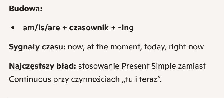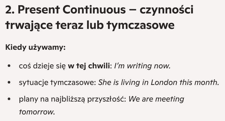 2. Present Continuous – czynności trwające teraz lub tymczasowe
